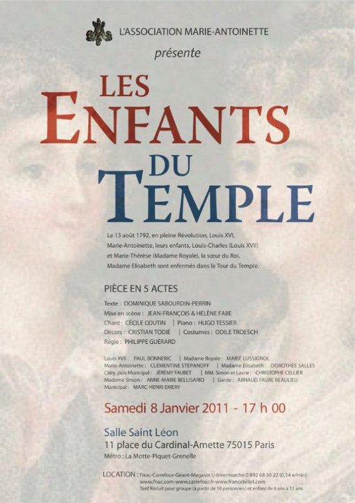Louis XVII : Paul Bonneric Madame Royale : Marie Lussignol Marie Antoinette : Clémentine Stépanoff Madame Elisabeth : Dorothée Salles Cléry puis Municipal : Jérémy Faubet MM. Simon et Lasne : Christophe Cellier Mme Simon : Anne Marie Bellisario Garde : Arnaud Faure Beaulieu Municipal : Marc-Henry Emery